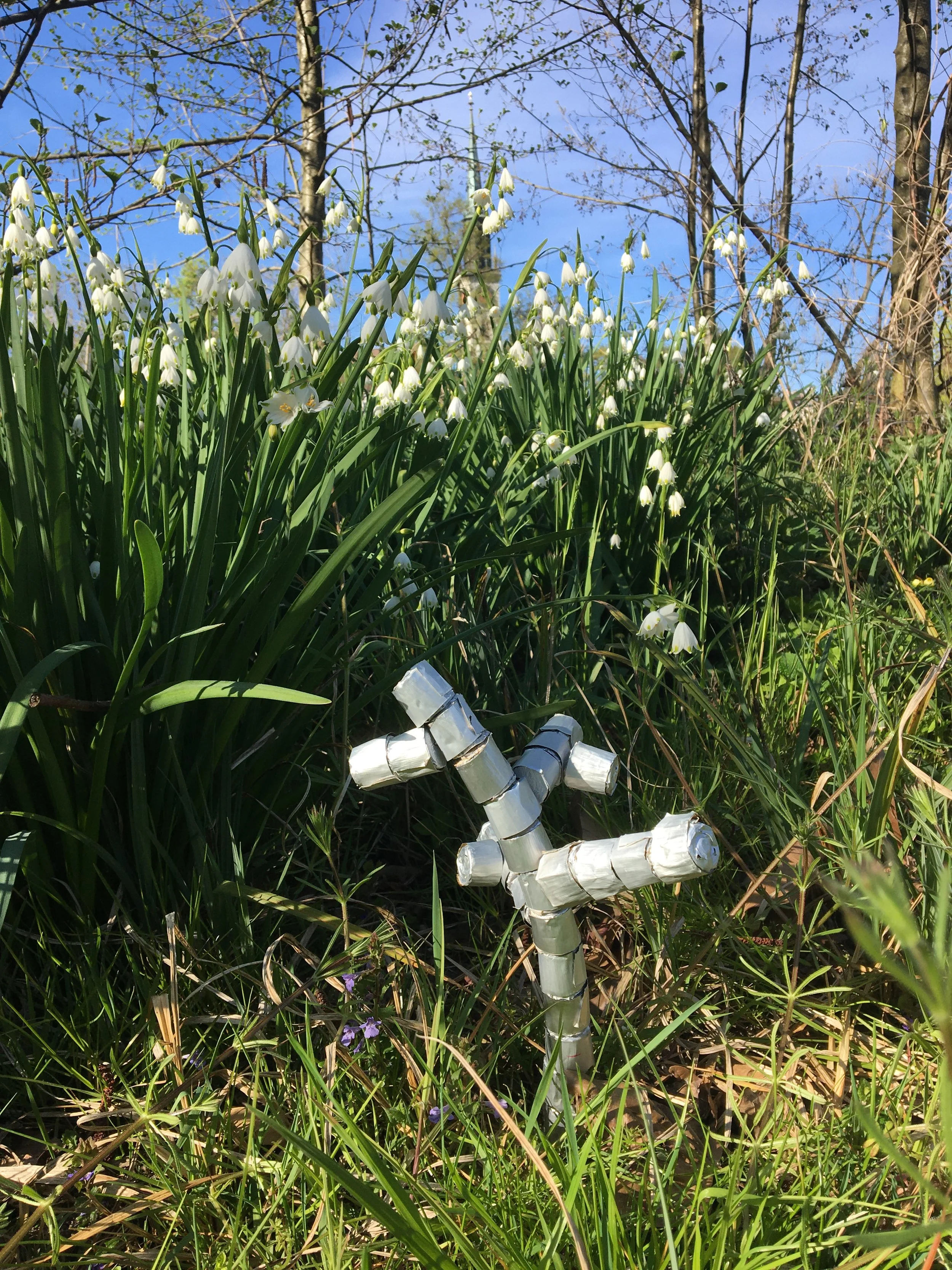 Originally, this piece was a two meter tall tree made of tins. Instead, in adapting to the current situation the size of the tree was minimised to 25cm and created from materials available from home: Nespresso capsules and cork. The idea was to use reusable materials that could be recycled after the exhibition.